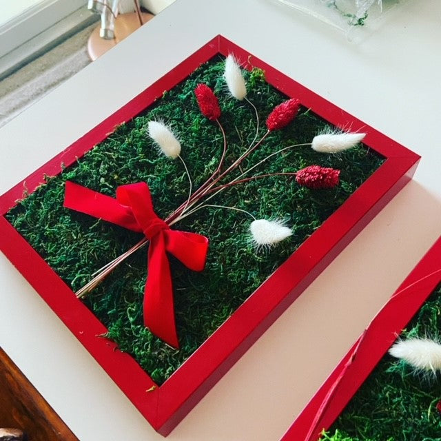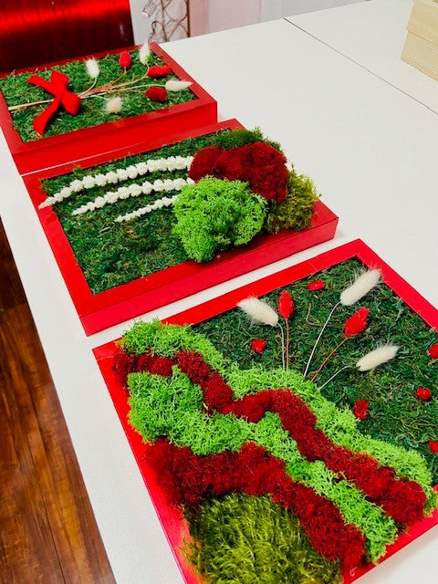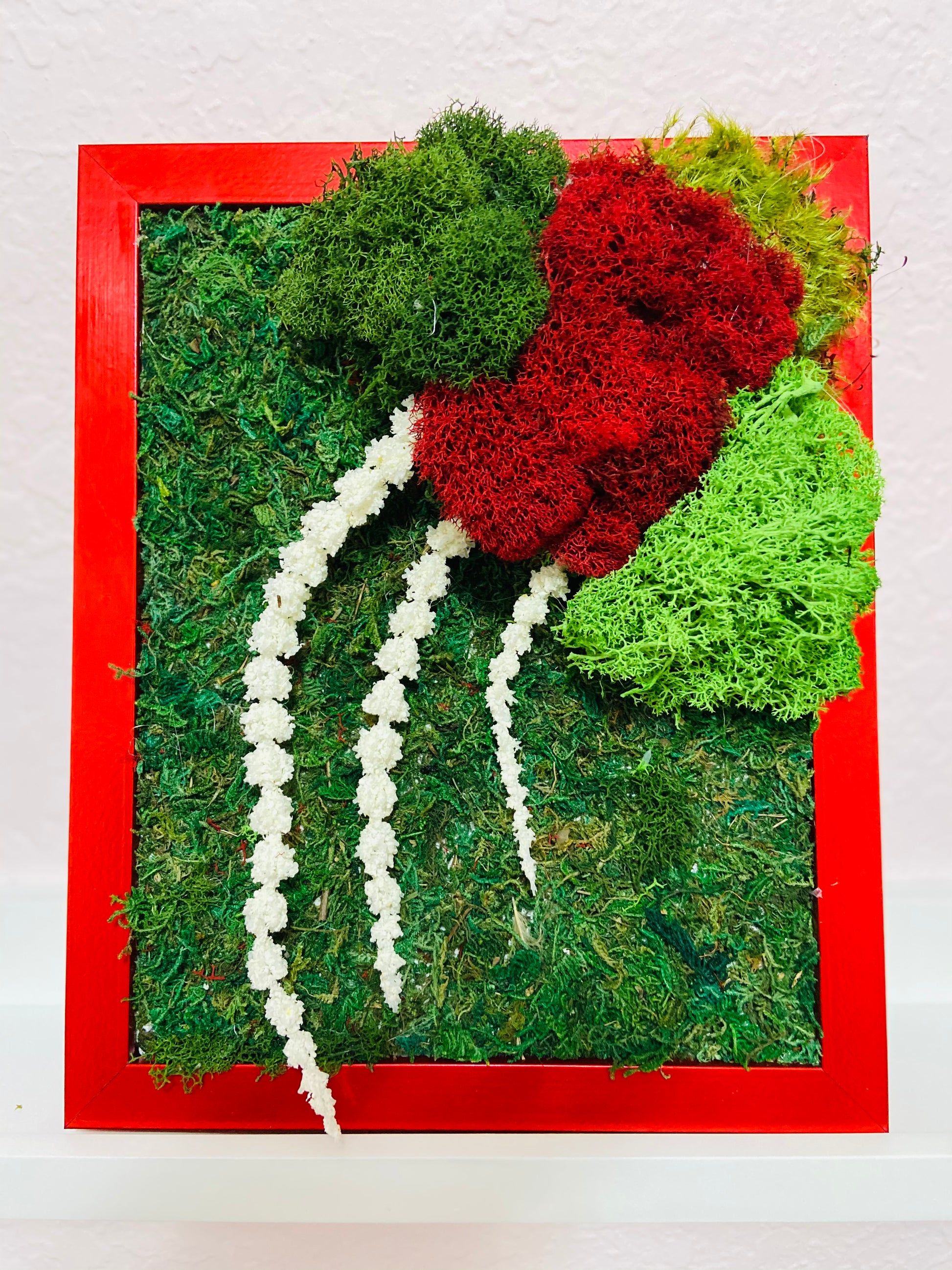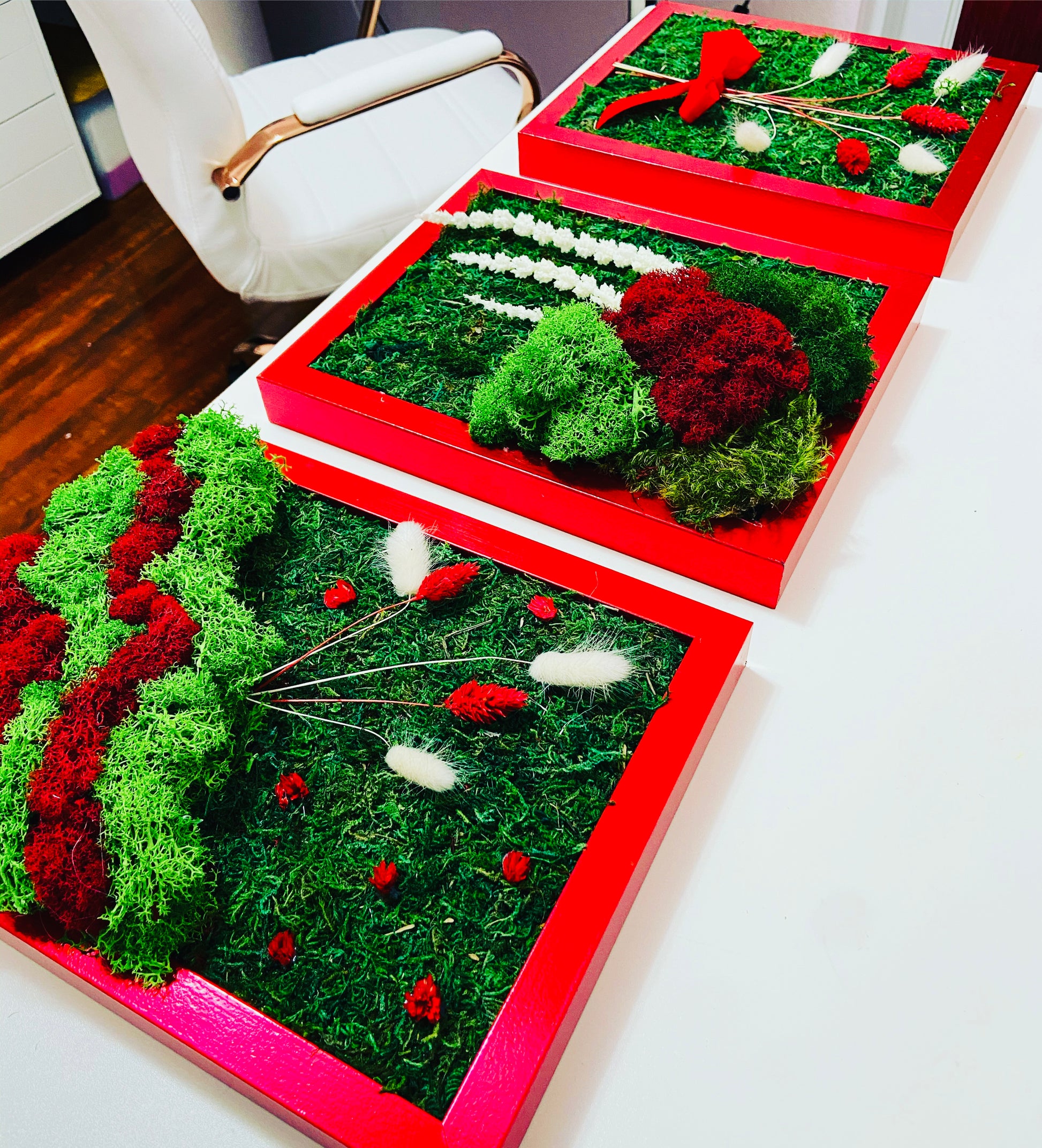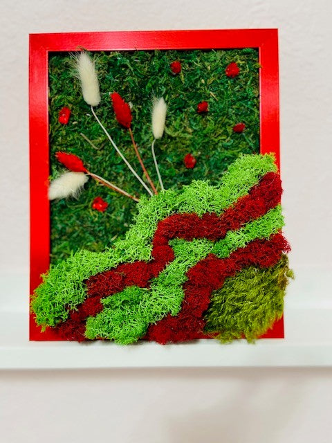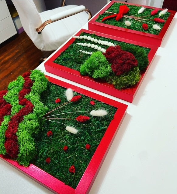 Experience the beauty of nature in your home with our Red Moss Wall Art Set! Handmade with real preserved moss, bunny tails and ferns, each 8"X 10"X 1" frame is unique. No maintenance required, just hang and enjoy! Made to order with a stunning red metal frame. Bring the outdoors in, order now!