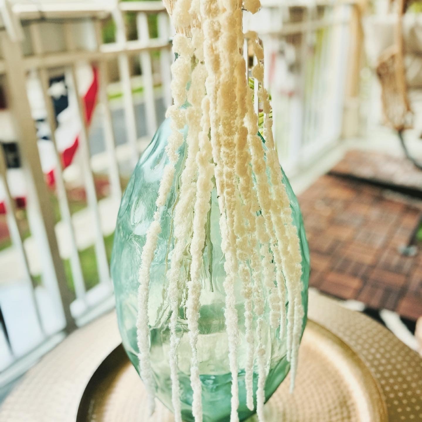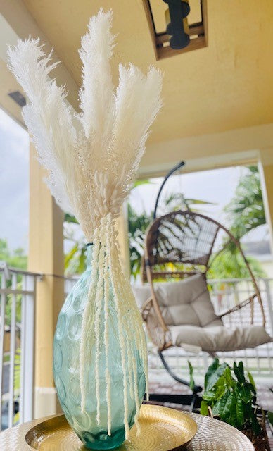 - Bleached white Pampas Grass (35"), Italian Ruscus, Bunny tails, and hanging Amaranthus. Vase included.