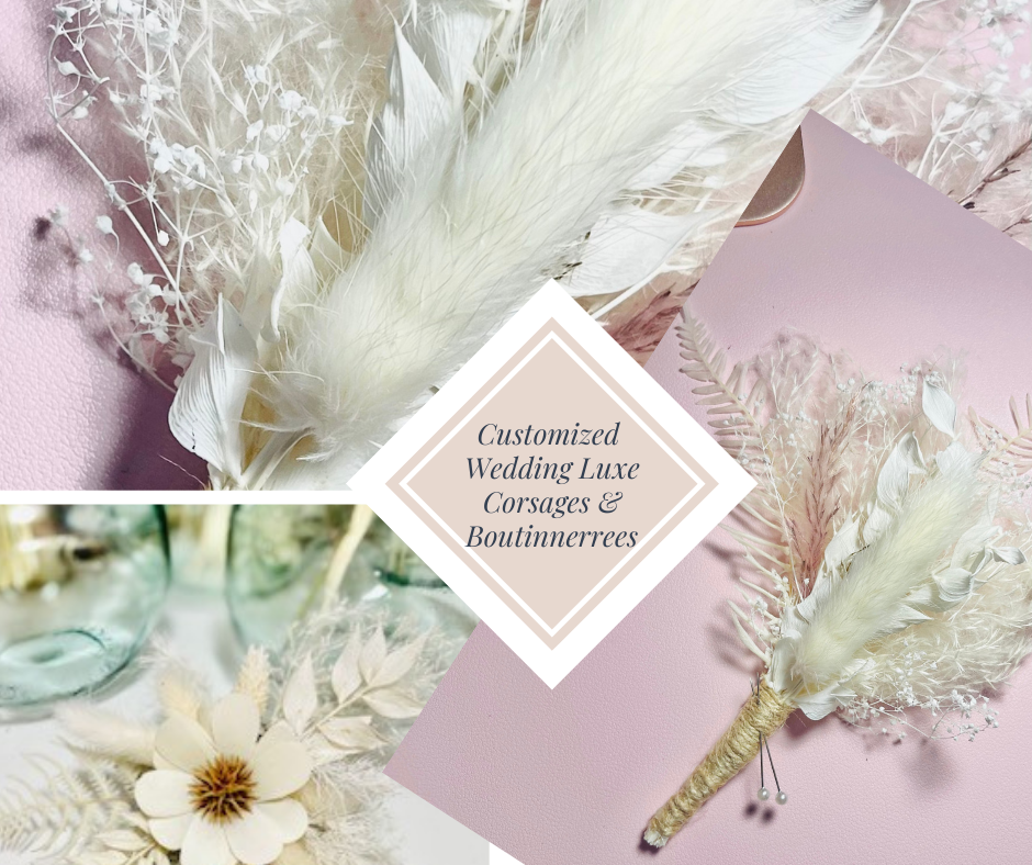 - Boutonnières & Corsages are made with dried & preserved flowers of your choice.