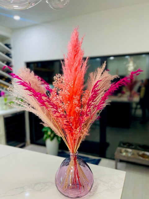 A beautiful combination of light and hot pink 32 inch pampas grass infused with a few fuchsia oat stems all the way around a glass pink vase.