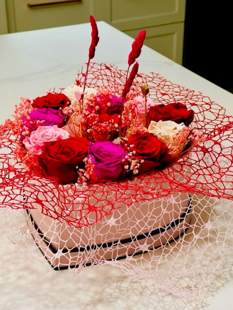 A beautiful combination of a dozen fuchsia, light pink, and red everlasting roses layered on a light pink & red mesh sheet in a 11 inch heart shaped box.