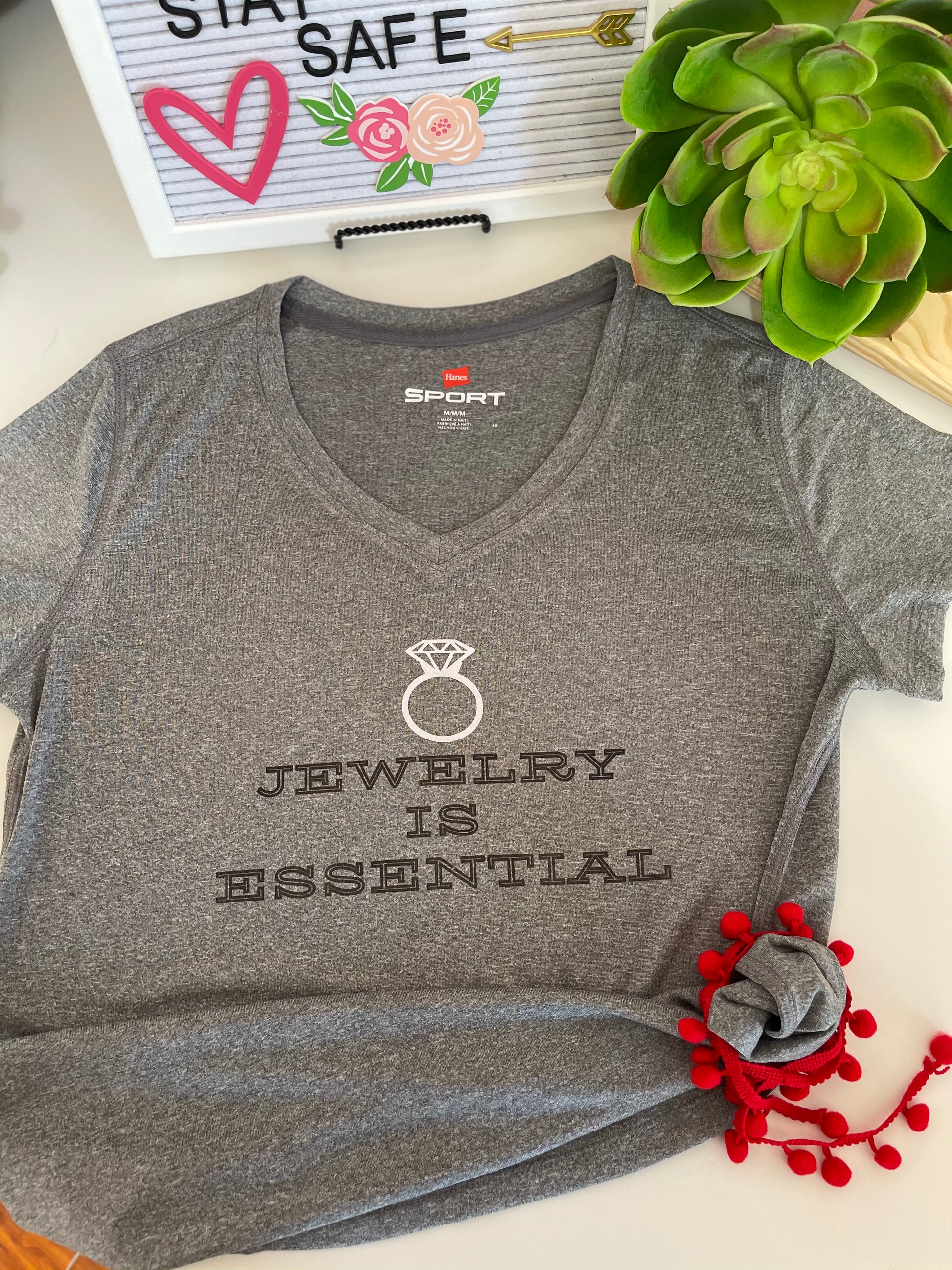 - Women's V-Neck T-Shirt 63% polyester 33% rayon, and 4% spandex.
