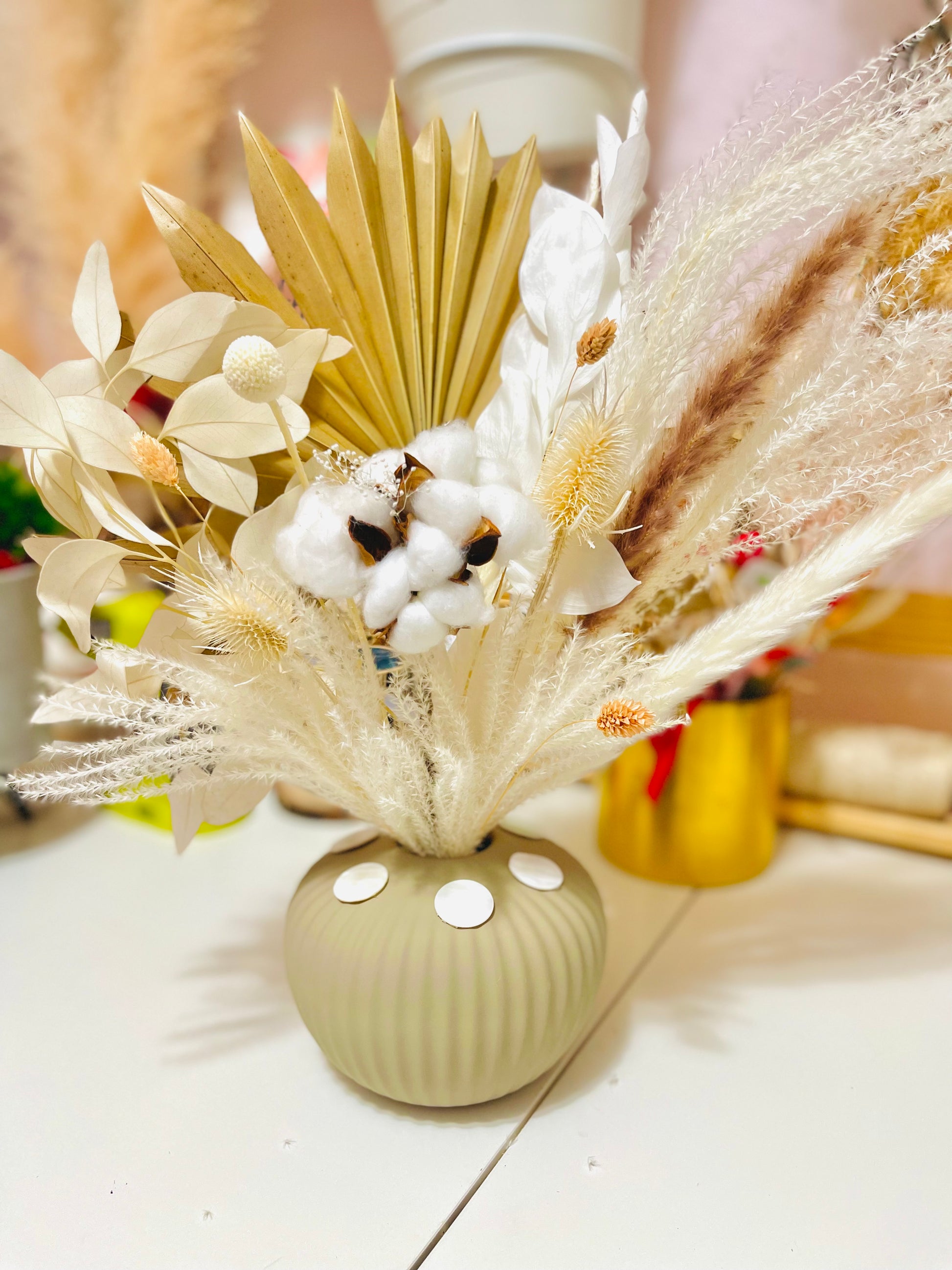 "Neutral Nirvana: A Journey into the World of Dried and Preserved Flower Arrangements Featuring Palm Leaves, Pampas Grass, Cotton Flowers, and Italian Ruscus!"